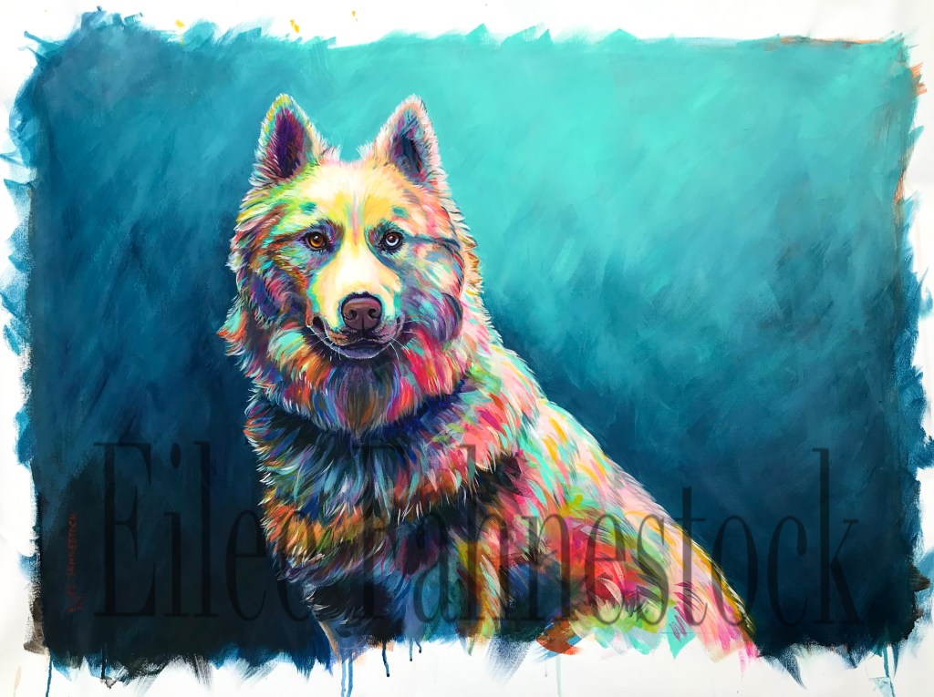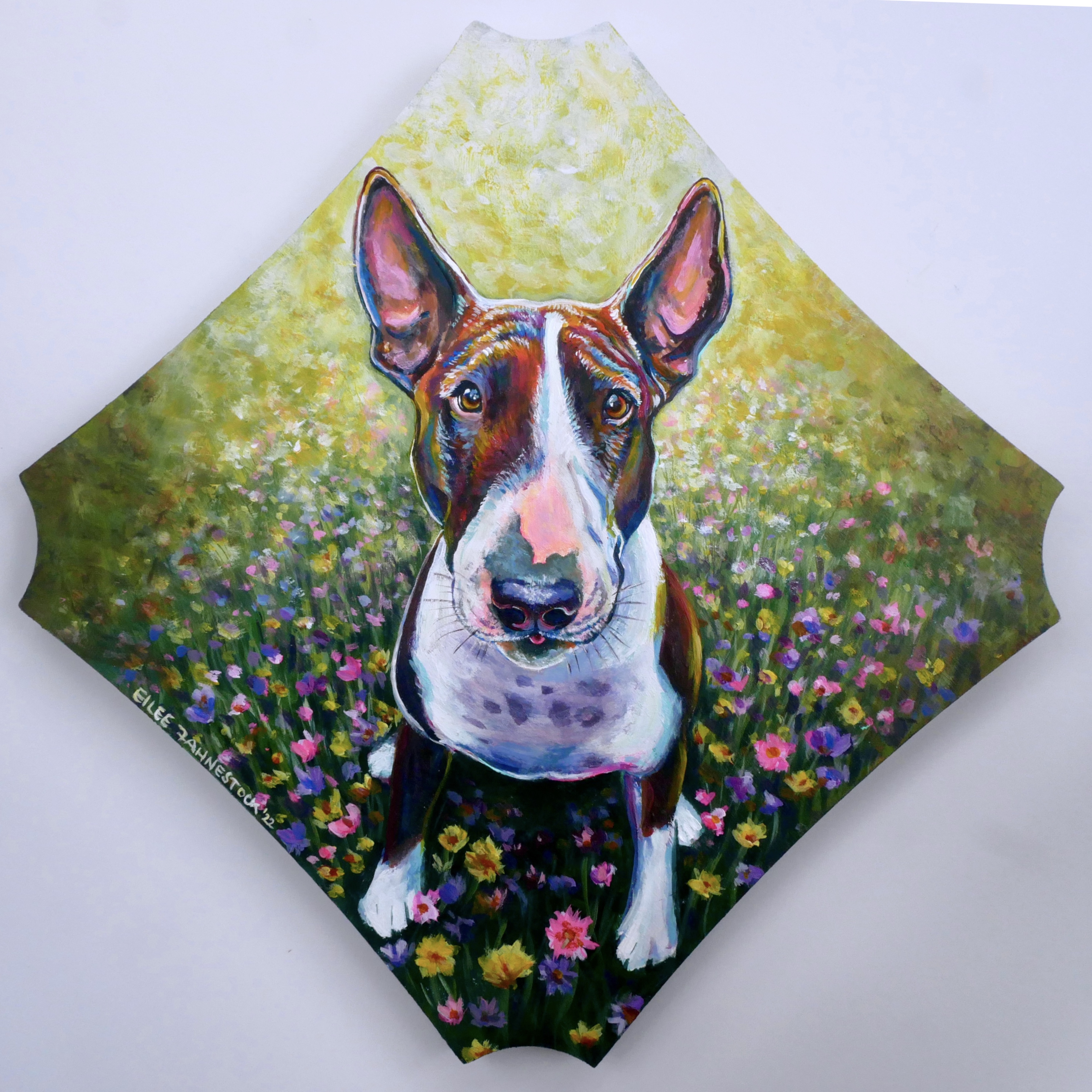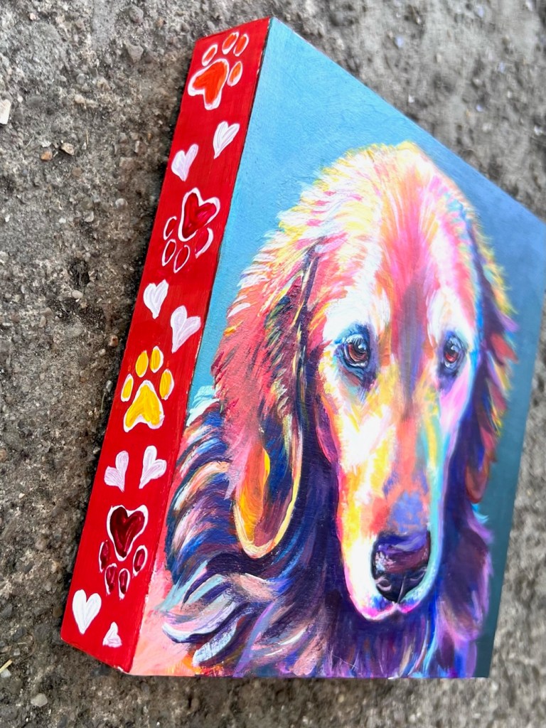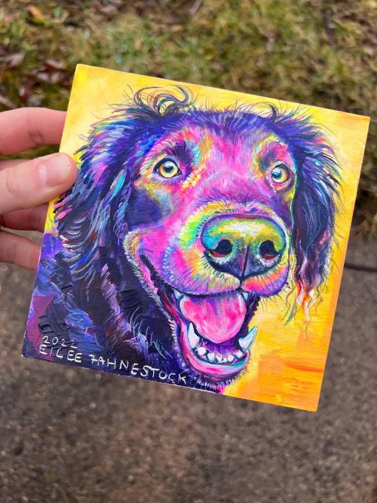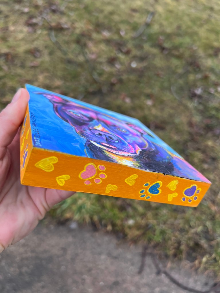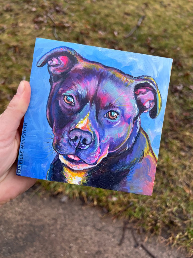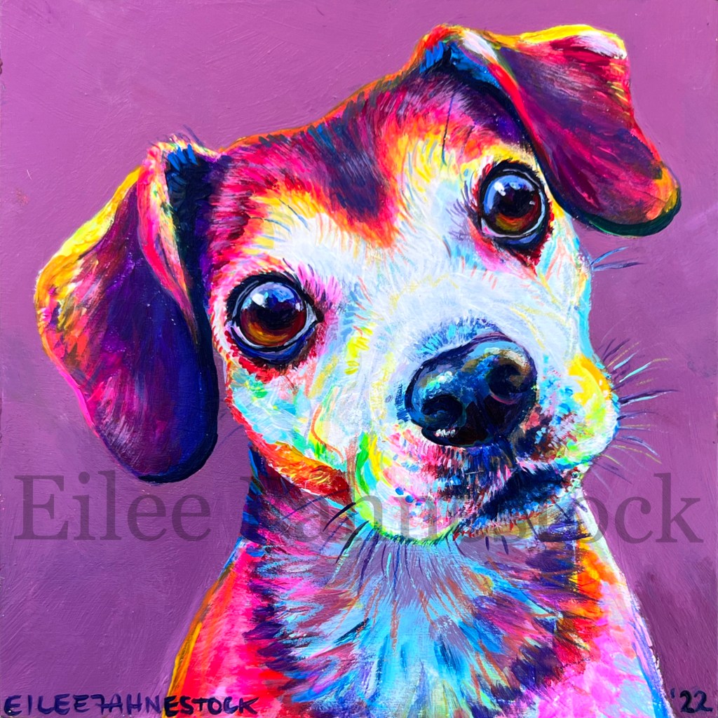 Colorful, custom painting of your pet on wood panel (or canvas by request). Small additions like a bowtie, bandana, favorite toy, etc. no additional cost.