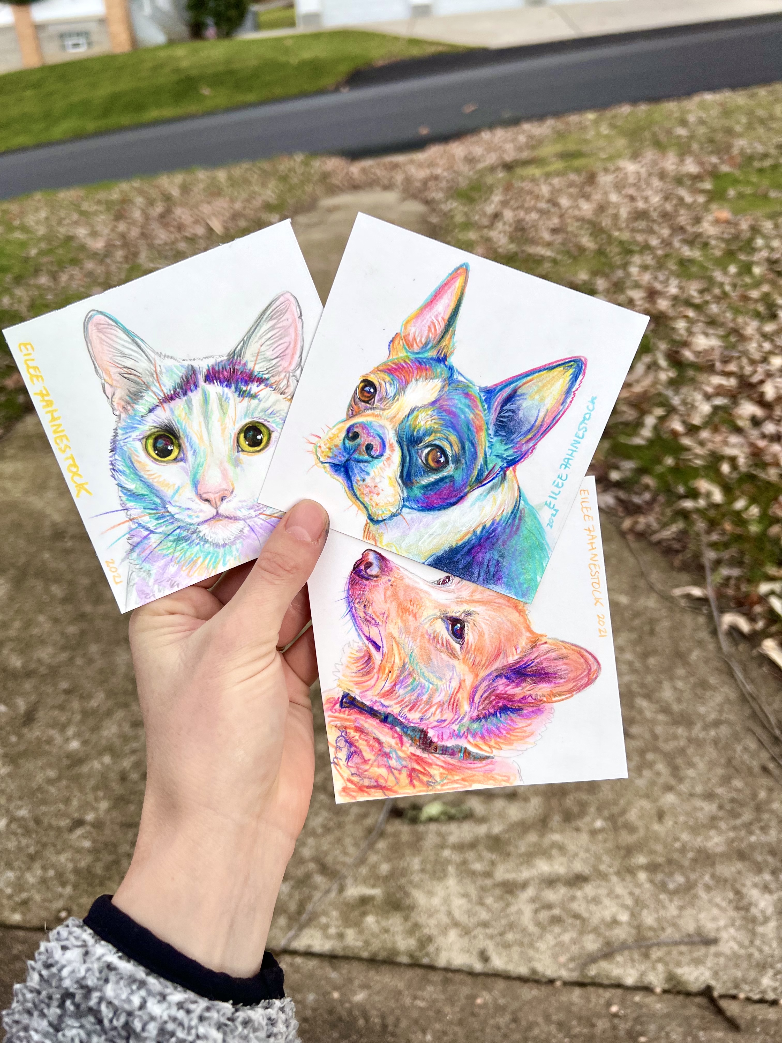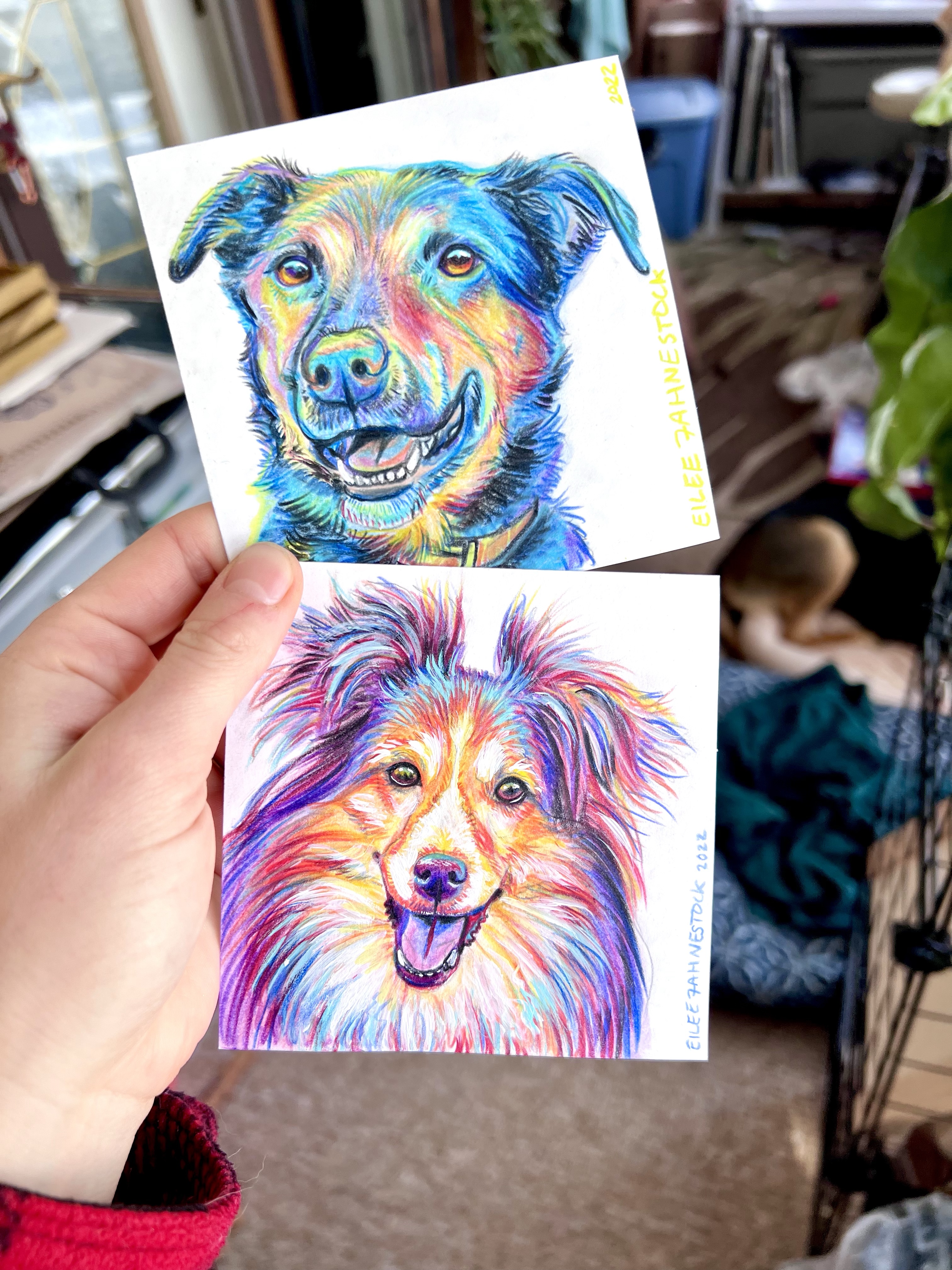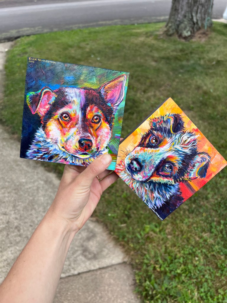 I offer two types of pet portraits at different price points Acrylic Paintings on wood panel, or Mixed Media Drawings on paper. Scroll down for info on each style.